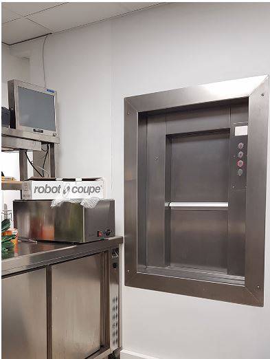 Dans la gamme petite taille, nous pouvons installer un monte-charges avec des portes guillotine (ouverture verticale) à hauteur des mains, ou avec des portes battantes au ras du sol.